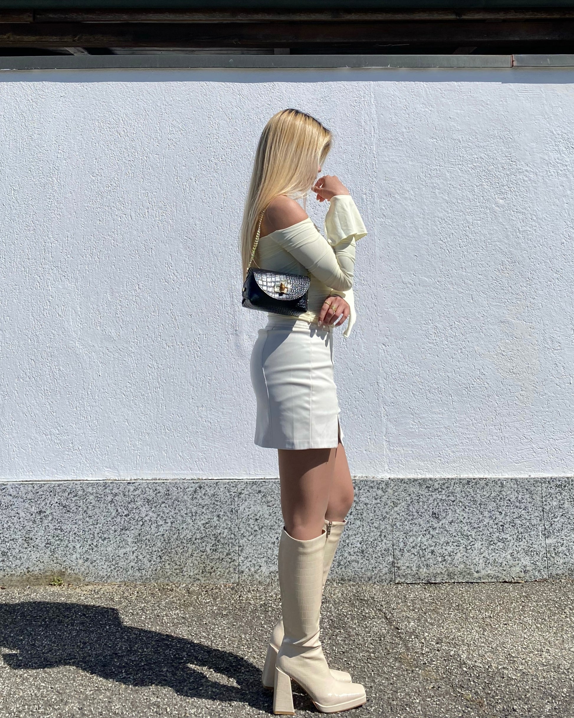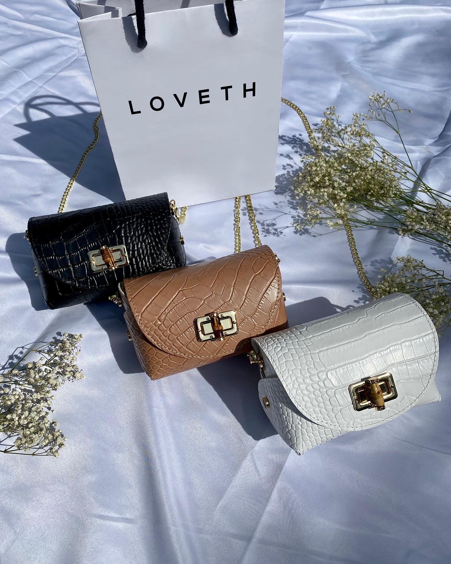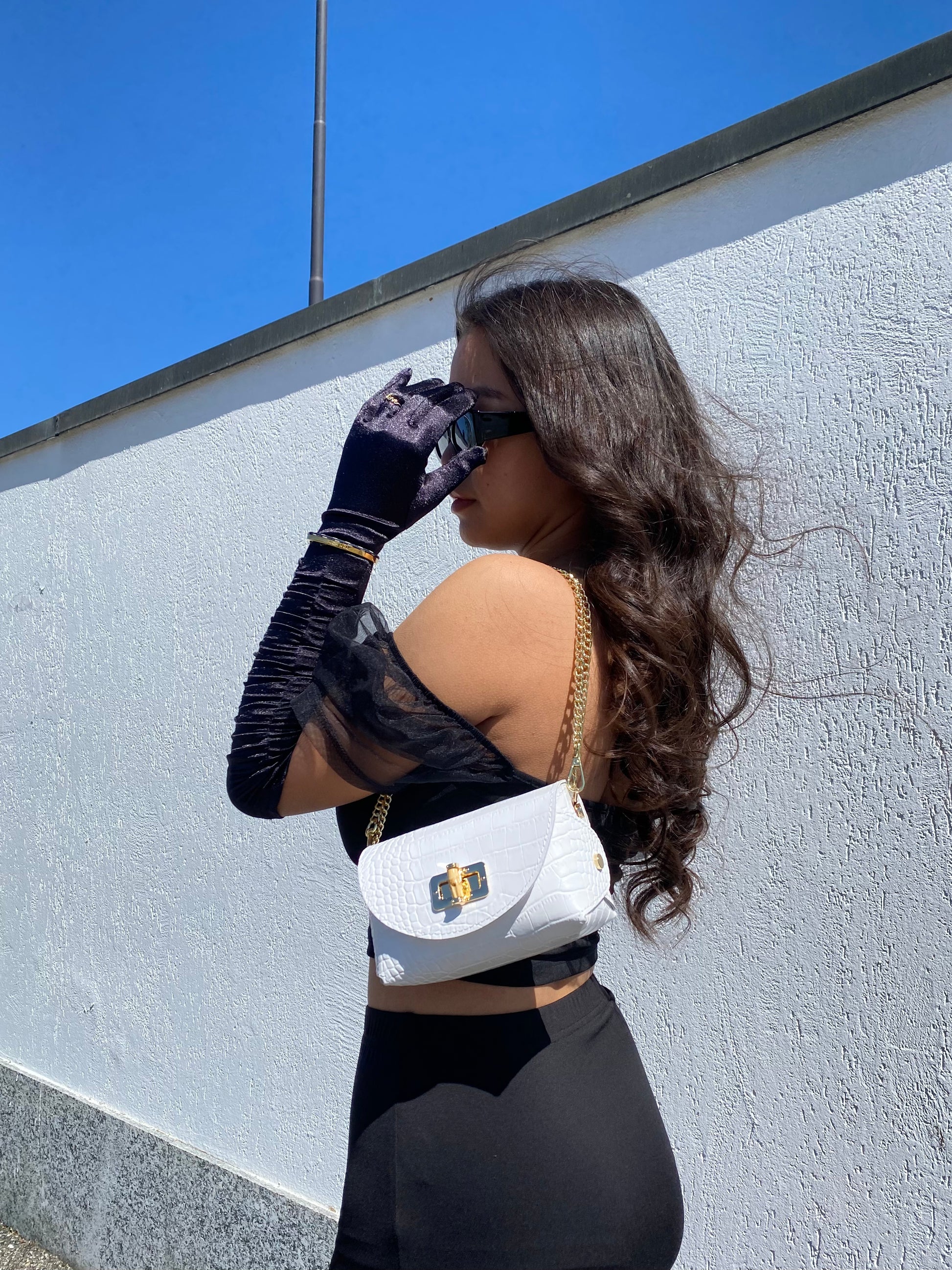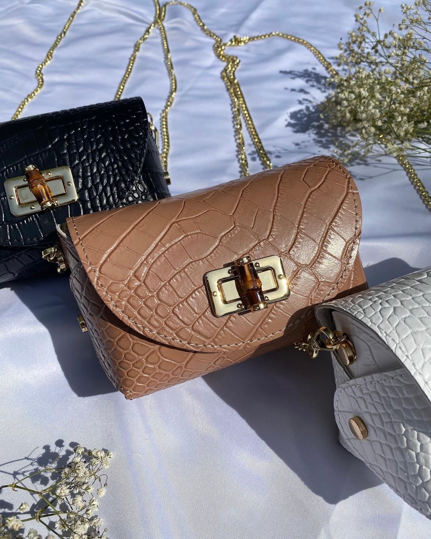 La mini Amanda che porta i tuoi oggetti essenziali, piccola ma molto capiente, fatta di vera pelle croc embossed. Dimensioni: 16x11x9cm, catena 60cm. Vera Pelle Made in Italy. Hardware Oro. Chiusura in bambù a rotazione.