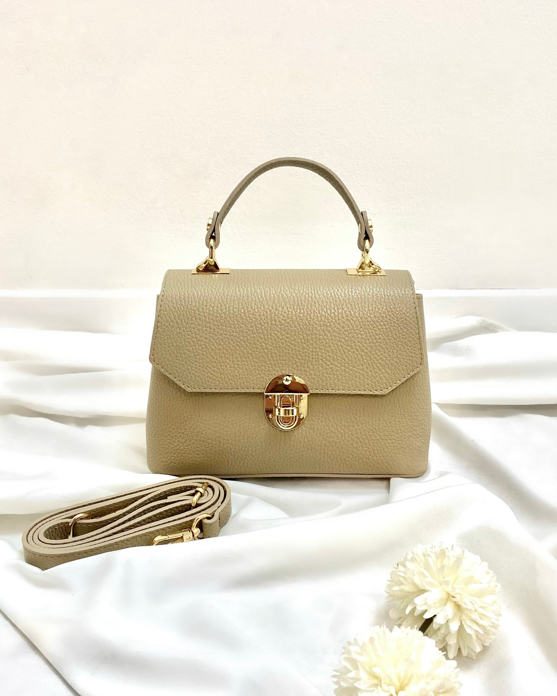 Graziosa, comoda e dolce Criseliza fatta in vera pelle made in Italy. Dimensione: 22x15x13cm, tracolla regolabile 118cm. Hardware Color Oro.